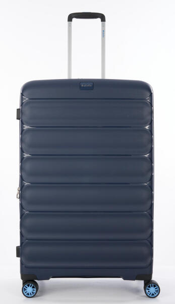 Modern, ultrakönnyű, 66 cm-es műanyag bőrönd az olasz Dielle márkától, kék csíkos színben.