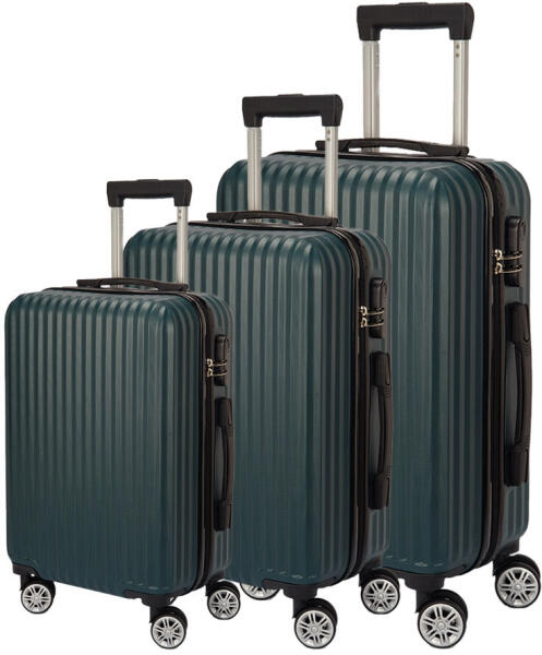Dollcini Világjáró ABS Bőrönd Szett - 3 darabos, Sötétzöld ? Ez a strapabíró, mégis könnyű bőrönd szett tökéletes útitárs minden kalandhoz. Az ütésálló ABS keményfal maximális védelmet nyújt a poggyászodnak, míg a praktikus kialakítás és a kényelmi funkciók gondtalan utazást biztosítanak. ✈️ Főbb jellemzők: ? Ütésálló ABS keményfal: Védi a tartalmát az utazás során. ? 360°-ban forgó dupla kerekek: Könnyű manőverezés minden irányba. ?️ Ergonomikus teleszkópos fogantyú és két kézifogó: Kényelmes húzás és emelés. ? Biztonsági zár: Extra védelem a személyes tárgyaknak. ?️ Rekeszes belső kialakítás állítható pántokkal: Rendezett és stabil csomagolás. Méretek:Méret Külső méretek (cm) Súly (kg)Nagy 75 x 46 x 30 3.78Közepes 65 x 40 x 26 3.05Kicsi 55 x 35 x 22 2.41? Származási hely: Szlovákia Fontos megjegyzés: A méretek kézi méréssel készültek, ezért 1-3 cm eltérés előfordulhat.