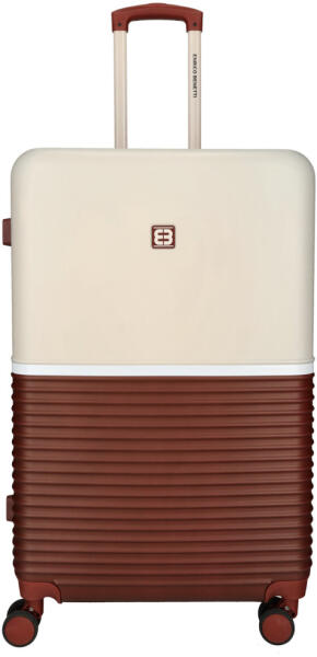 Enrico Benetti Princetown nagy méretű, elegáns bőrönd. 2-4 hetes utazáshoz ajánljuk. Anyaga karcálló, flexibilis, robusztus ABS. Strapabíró dupla kerekes, finoman gördülő négykerekű. Tetején és oldalán fix kézbefogó fogantyú. Tetején két szekcióban kihúzható, masszív húzokarral. Körbe cipzáras záródású. Az oldalán 3-jegyű számzár, a fő cipzárak lezárásához. A számzár egyénileg, tetszés szerint egyszerűen programozható. Belül a bélelt poliészter tere lenyűgöz. Belseje két rekeszes, cipzáras elválasztókkal, cipzáras zsebbel és állítható ruha rögzítő kereszt pántokkal. Méretek (szélesség x magasság x mélység) 52 x 75 x 30 cm (magába foglalva a kerekeket, fogantyúkat). Súlya 4,4 kg. Térfogata 117 l. Garancia 2 év.