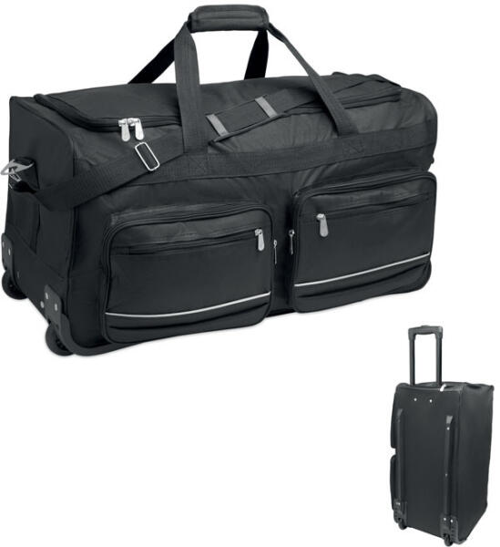 Puha gurulós utazótáska 600D RPET anyagból. Cipzáras elülső zsebbel, két oldalsó nyitott zsebbel és három belső rekesszel. Párnázott vállpántokkal, 2 kerékkel és dupla csővázzal.