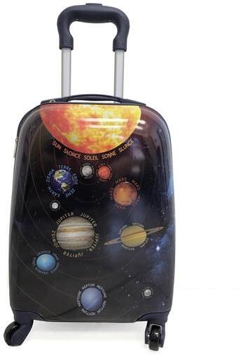 Megérkezett a Naprendszer mintával díszített 4 kerekű utazóbőrönd kis rajongóknak. Az ütés- és horpadásálló, vízálló, tartós (ABS) anyagból készült, strapabíró, gurulós gyermekbőrönd  megkönnyíti a hosszú utazásokat. A praktikus, 32 liter űrtartalmú , belül két tágas rekesszel - az egyik állítható ruhalefogató pánttal, a másik cipzáros zsebbel - ellátott kofferben kényelmesen elfér gyermekünk holmija, melyet ő maga tud húzni az állítható fogantyú segítségével.  A táska kétirányú cipzárral záródik, súlya kb. 1,1 kg , így a fogantyút használva kézben is könnyedén szállítható.  A saját bőröndnek és az önálló csomagolásnak köszönhetően gyermekünk elindulhat a függetlenné válás útján, felelősséget vállalva saját holmijáért. Használat előtt a védőfóliát el kell távolítani, hogy a fényes felület előtűnjön.