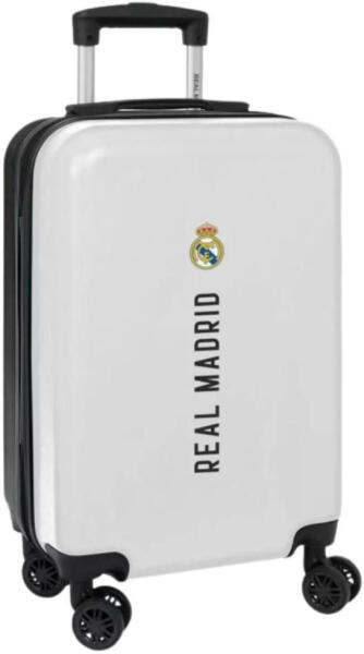 A bőröndöt Real madrid felirat és logó díszíti, fehér alapon.