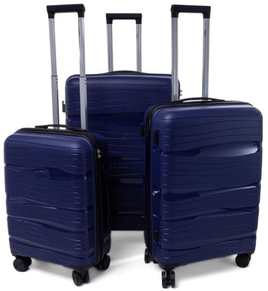 Sötétkék 3 darabos műanyag bőröndszett „Royal, 4 kerékkel, teleszkópos fogantyúval, modern aerodinamikus formával + 2 ajándék és INGYENES szállítás!