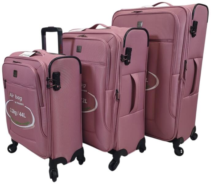Három részből álló, erős fényes mályva színű poliészterből gyártott, Tuareg márkájú bőröndszett. Legkisebb bőröndje repülőgépre felvihető méretű, a nagyobbak orgonasíp szerűen növekvő ...