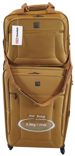 Két részből álló, erős fényes mustár árnyalatú poliészterből gyártott, Tuareg márkájú bőrönd, fedélzeti táska szett. A nagy bőrönd zippes betétjének segítségévek bővíthető...