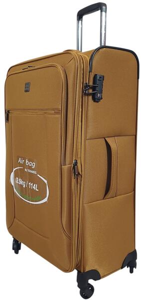 Mutatós,  erős fényes mustársárga árnyalatú poliészterből gyártott, Tuareg márkájú puha bőrönd. Nagy méretű darab, jelentősebb mennyiségű poggyász becsomagolására alkalmas, zippes bővítőjének kiengedésével ...