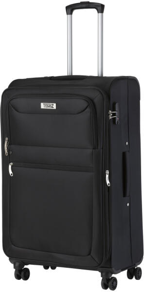 TravelZ Softspinner nagy méretű bőrönd. Könnyű és stílusos sorozat. Prémium Holland bőrönd. 2-4 hetes utazáshoz ajánljuk. Anyaga víztaszító poliészter. Strapabíró, 360 fokban finoman gördülő négykerekű. Tetején fix kézbefogó fogantyú és két szekcióban kihúzható húzokar. Körbe cipzáras záródású. Az oldalán 3-jegyű számzár, a fő cipzárok lezárásához. A számzár egyénileg, tetszés szerint egyszerűen programozható. Belül teljesen bélelet poliészter. Belseje kettő rekeszes, cipzáras elválasztóval és állítható ruha rögzítő kereszt pántokkal. Külső méretek (szélesség x magasság x mélység) 45 x 77 x 30 cm (magába foglalva a kerekeket, fogantyúkat). Súlya 3,9 kg. Térfogata 104 l. Garancia 1 év.